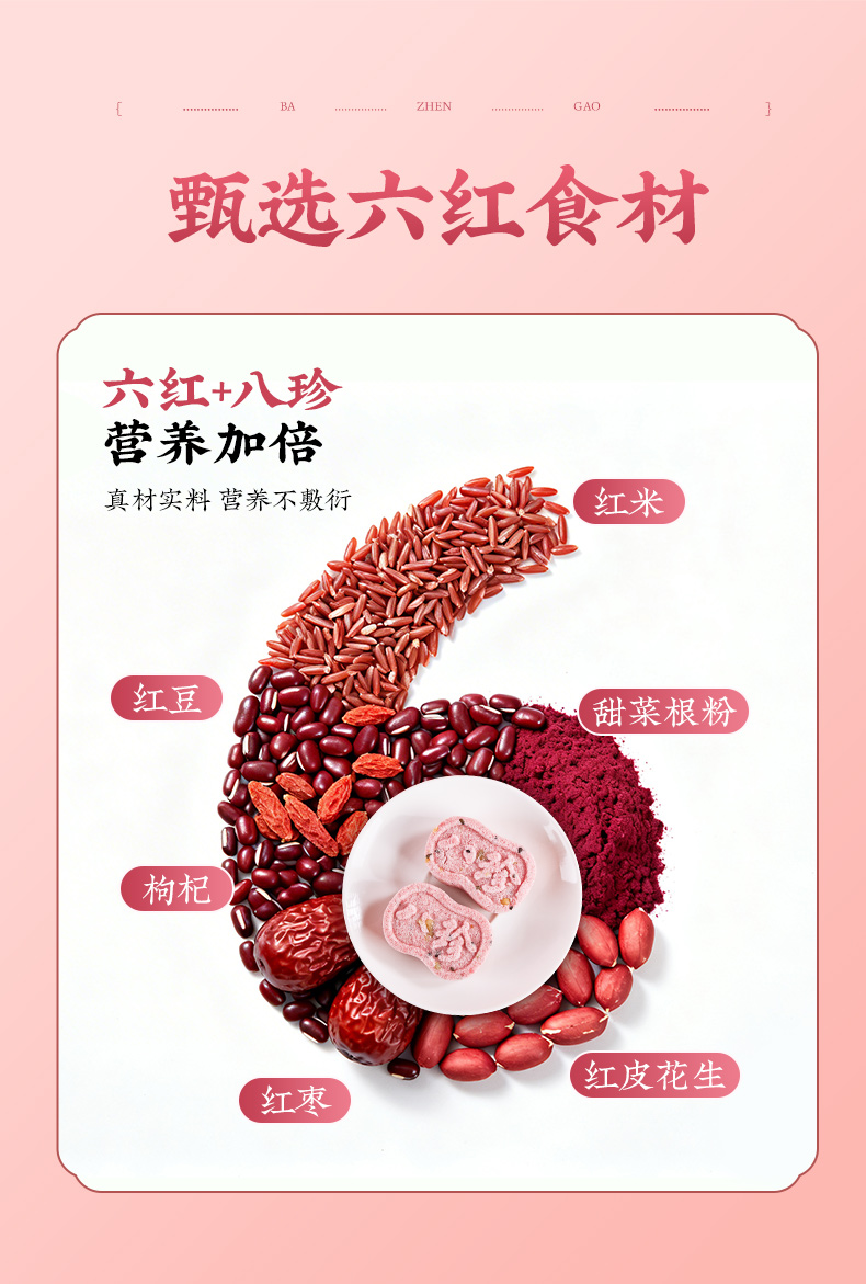 2.精选道地食材,在“八珍”之外,还加入六红食材,红米、红豆、红枣、红枸杞、甜菜根粉、红皮花生,以红养红。