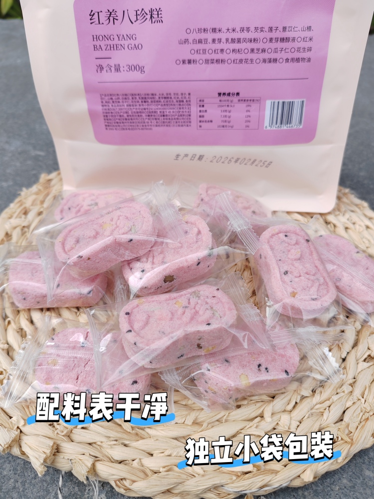 一袋八珍糕有300g,每一块都单独小包装,干净卫生!平时出门也能放包里,饿了吃一块,让人停不下来。