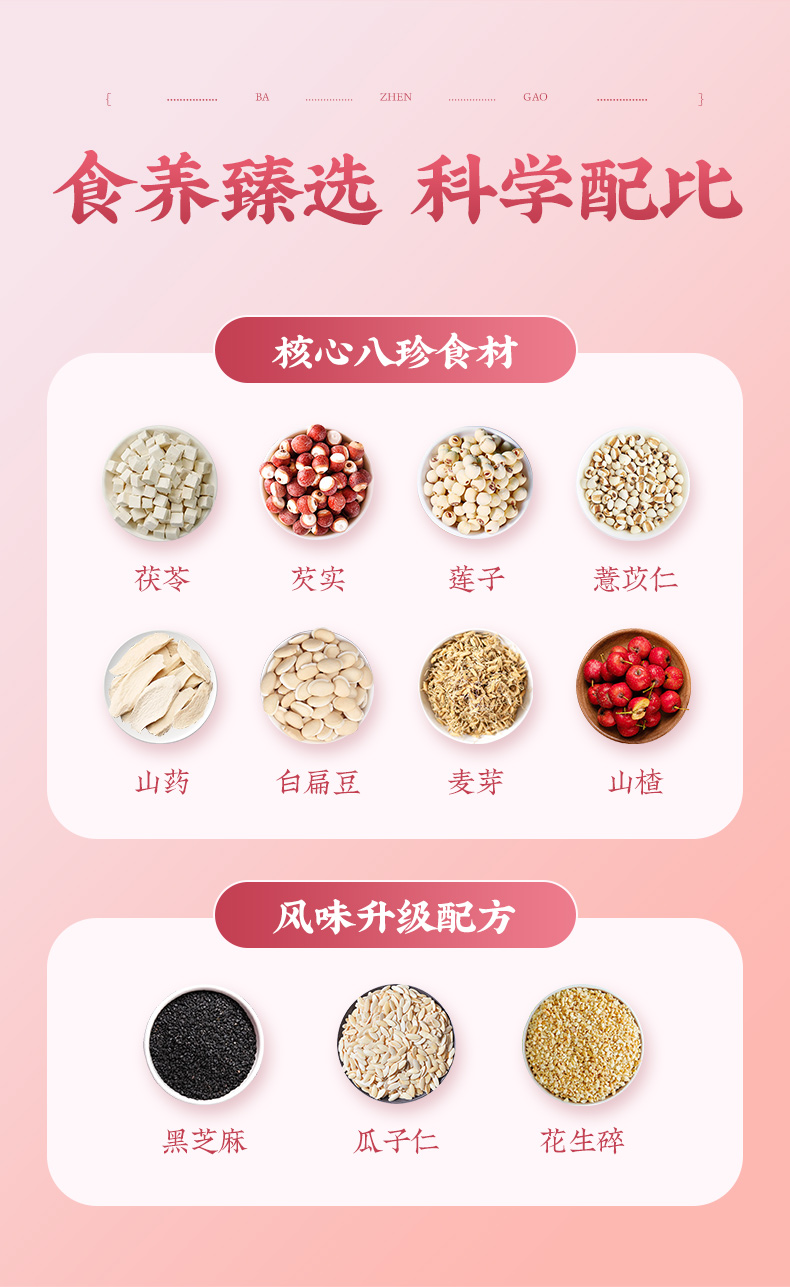 4.消食化滞:八珍糕中的茯苓、芡实、薏米等食材均具有开胃健脾、消食化滞的功效,对于脾胃虚弱、消化不良的人群尤为适宜。