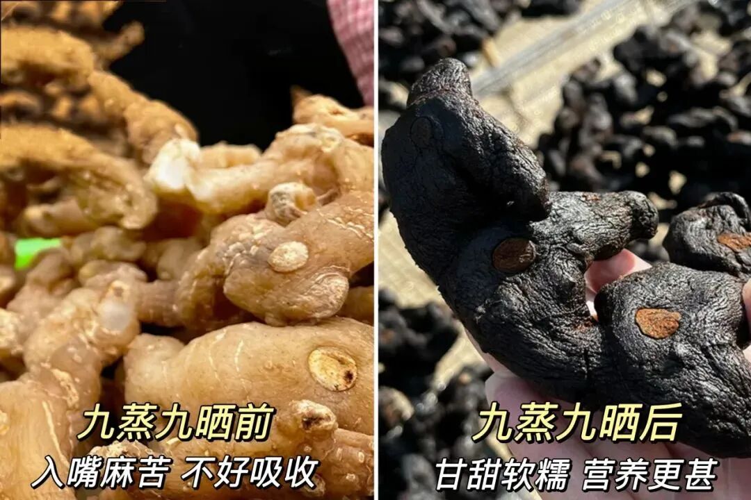 九蒸九晒,内外都变为黑色,这样才黑油亮!