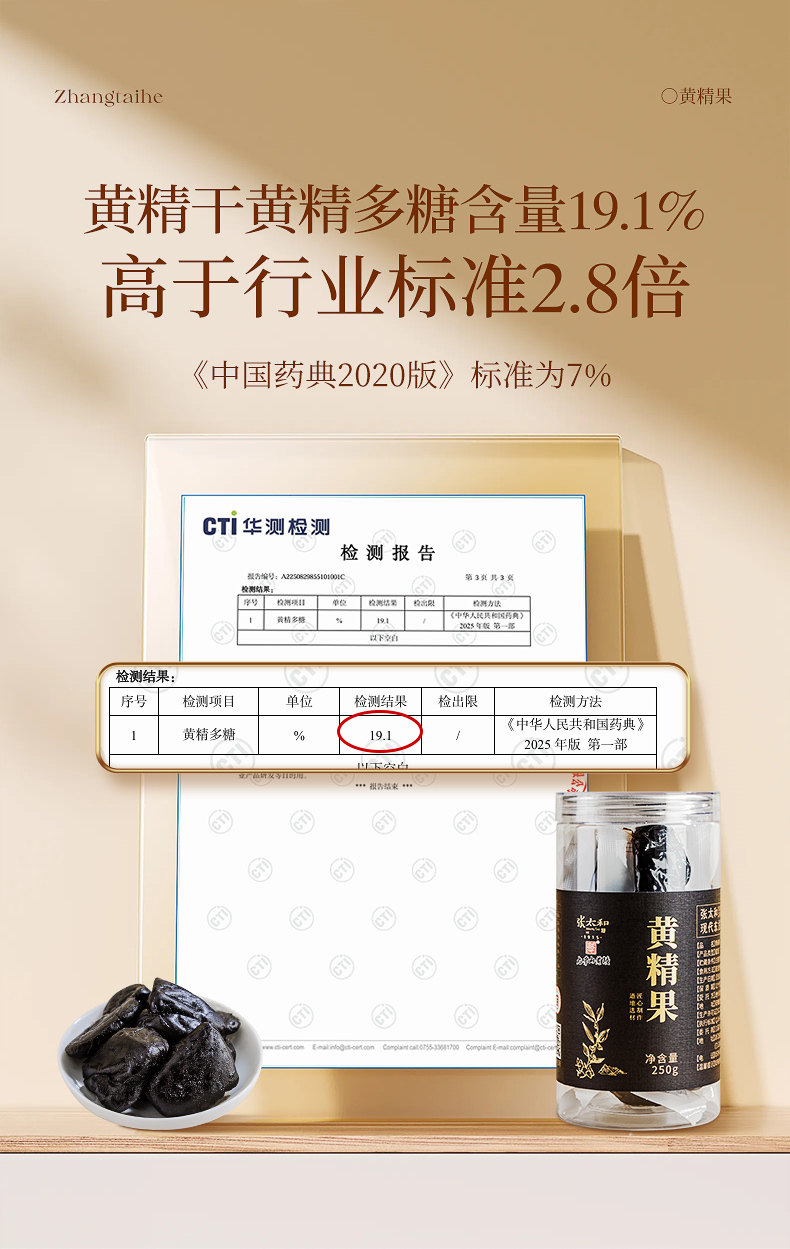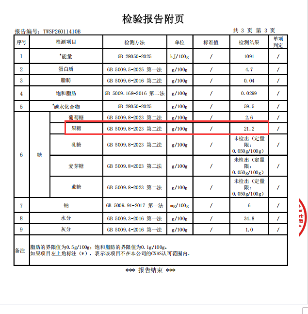 备注:黄精果检测报告中显示果糖含量21.2%,并非额外添加糖,而是黄精多糖中果糖成分的含量。