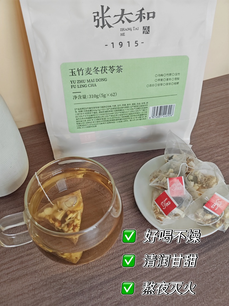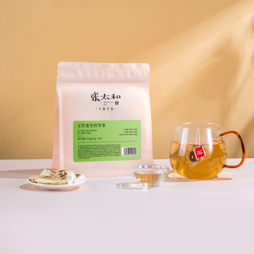 张太和玉竹麦冬茯苓茶根据清代《温病条辨》中的玉竹麦冬汤,升级了其配方,除了玉竹、麦冬,配以雪梨、茯苓、竹蔗、甘草、乌梅、百合、苹果、桔梗,多重成分协同作用,从而实现润燥滋润的效果。