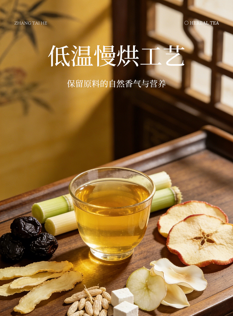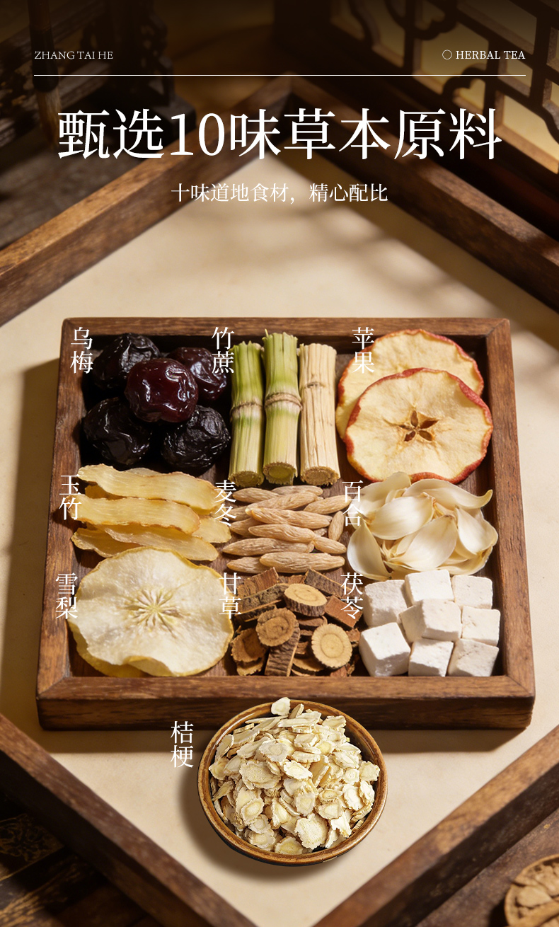 2.甄选10味原生草本原料,乌梅、竹蔗、玉竹、苹果、麦冬、雪梨、百合、甘草、茯苓、桔梗。