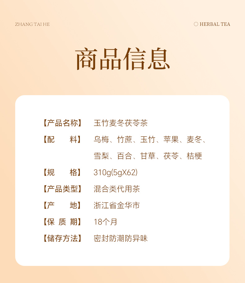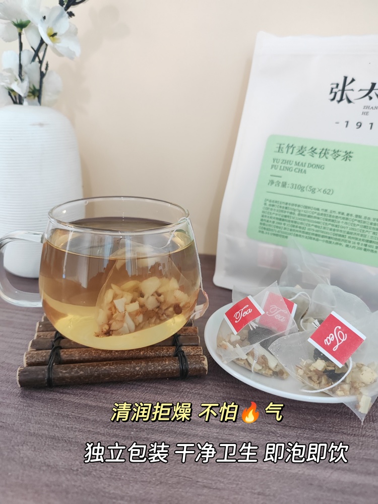 这款玉竹麦冬茯苓茶主要功效是:生津滋阴,润肺润燥,舒缓干燥、安抚睡眠,特别适合上班族、老师、吸烟人群和换季不适的朋友。