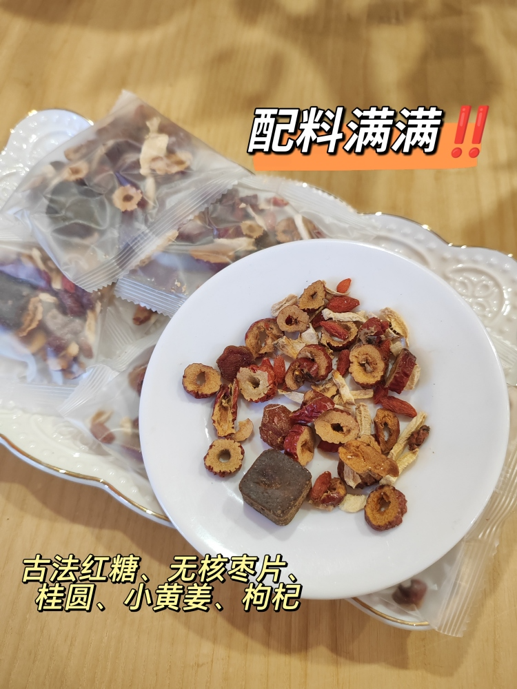 1、甄选五味配方,古法红糖、正宗枸杞、无核枣片、无核桂圆、小黄姜,用心熬制,营养价值高。