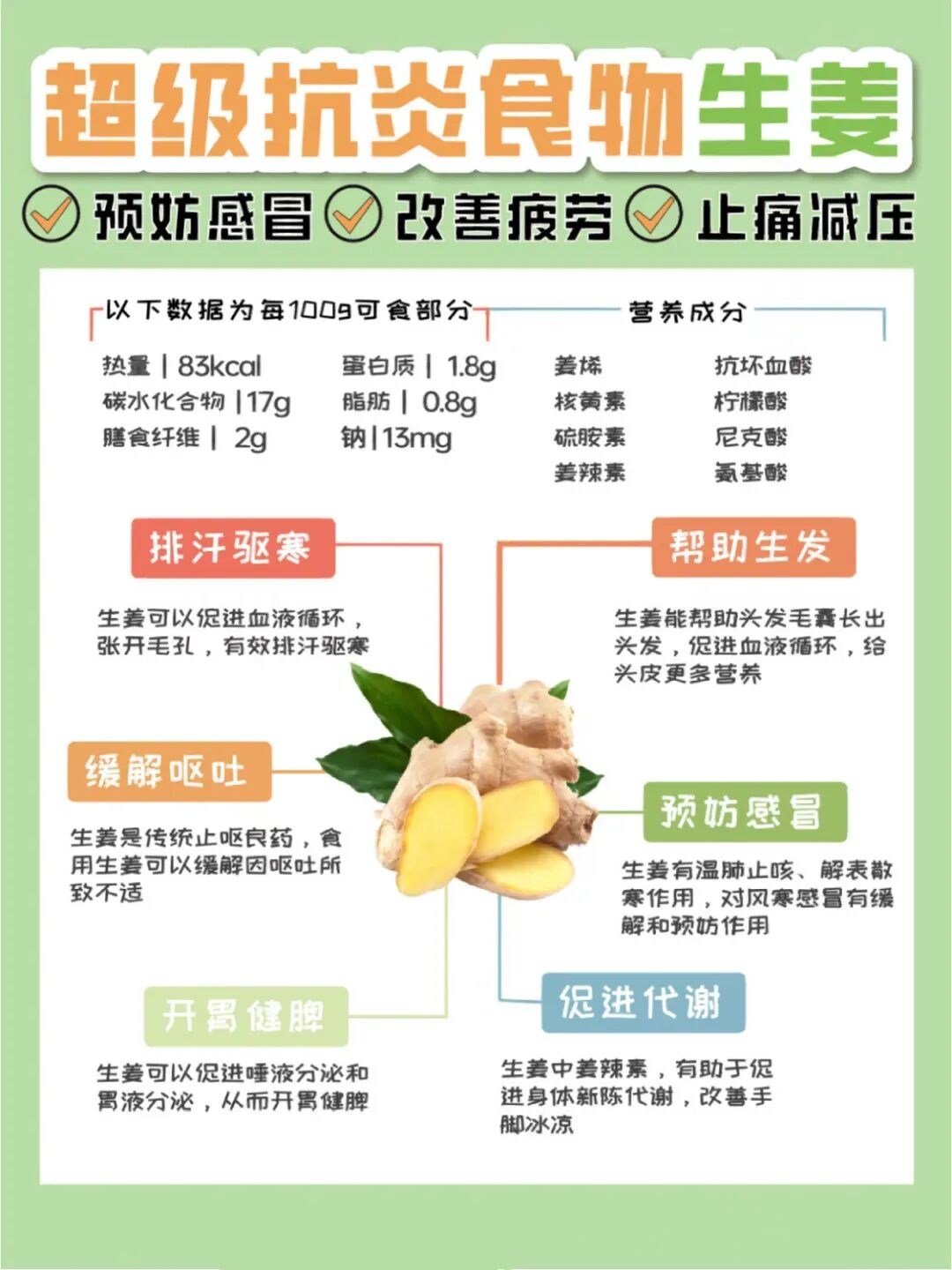 生姜性辛温,能发散风寒,温暖中焦(脾胃),尤其擅长驱散体内的寒气和湿气。红糖性温,能增强姜的温通效果。
